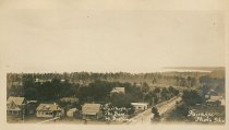 Aeriel photograph c. pre-1927 by Frank Stewart, The Picture Man, titled "Fairhope-The Bay in Distance" showing the curving shoreline of Mobile Bay and the intersection of Magnolia Avenue and Section Street in close view. The Fairhope Colony Cemetery is seen in front of the line of trees in the mid-distance. The first house on the left was owned at one time by Marietta Johnson (Director and co-founder of the School of Organic Education) and husba...