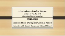 Interview (audio only) titled "Eastern Shore During the Colonial Period" dated June 29, 2013. Fairhope Museum of History, Director Donnie Barrett is interviewed by Michael Titford. In this wide-ranging interview, Barrett discusses the history of the Eastern Shore of Mobile Bay through the transition to Colonial times from when the population was primarily Native American Indian. Topics include Native American pottery, various settlements,...